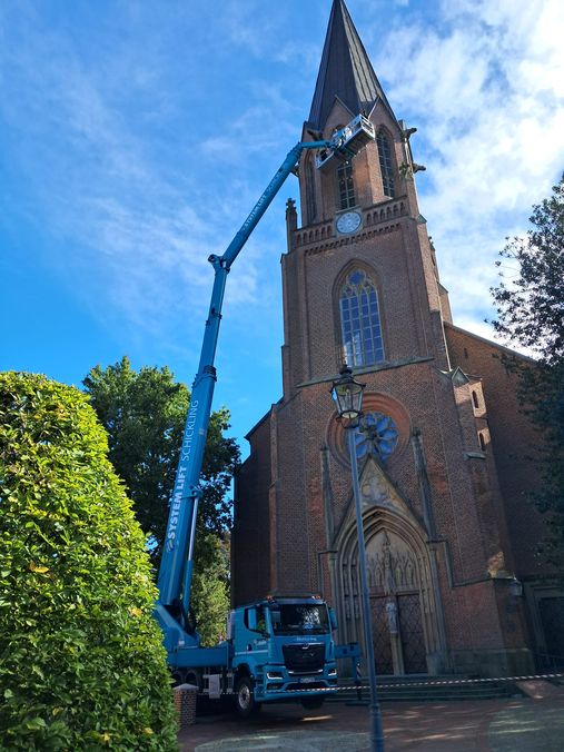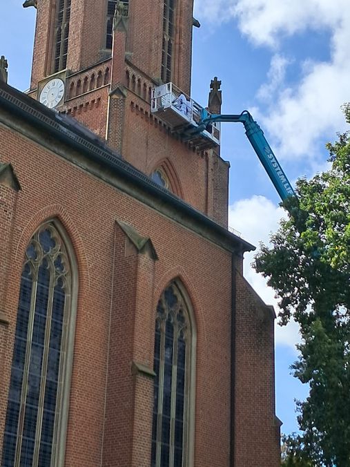 Dabei stellte man fest, dass auch das Zifferblatt neu gestrichen werden musste. Somit bot der Kirchturm im Sommer ein ungewöhnliches Bild.
