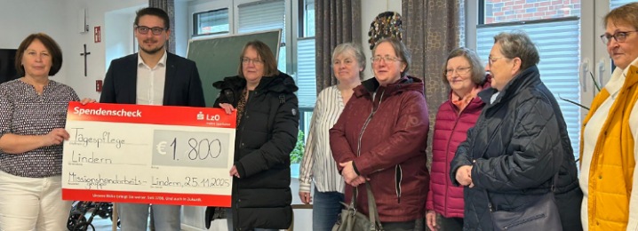 Nun konnten einige Mitglieder der Missionshandarbeitsgruppe einen obligatorischen Scheck in Höhe von 1.800,00 Euro an Anja Bakker überreichen, die die Tagespflege in Lindern leitet und an André Hachmöller, dem Geschäftsleiter des Seniorenzentrums Löningen/Lindern.